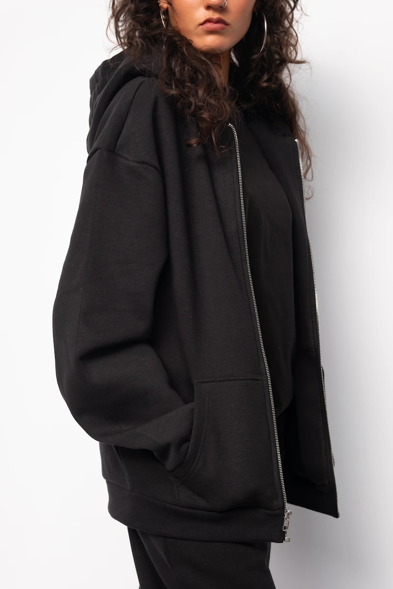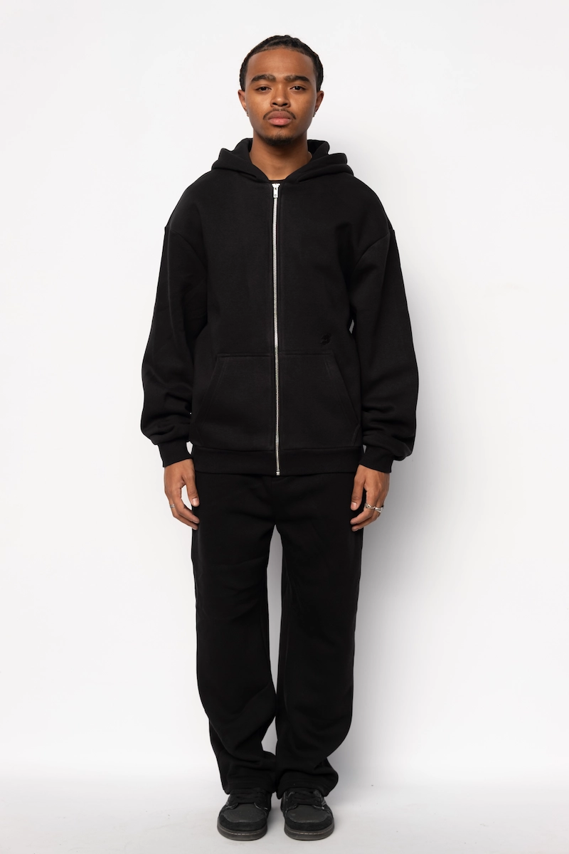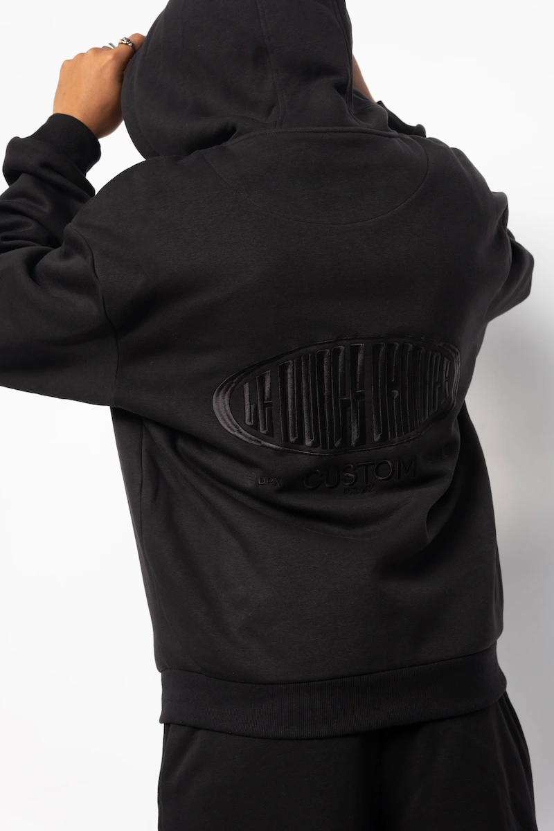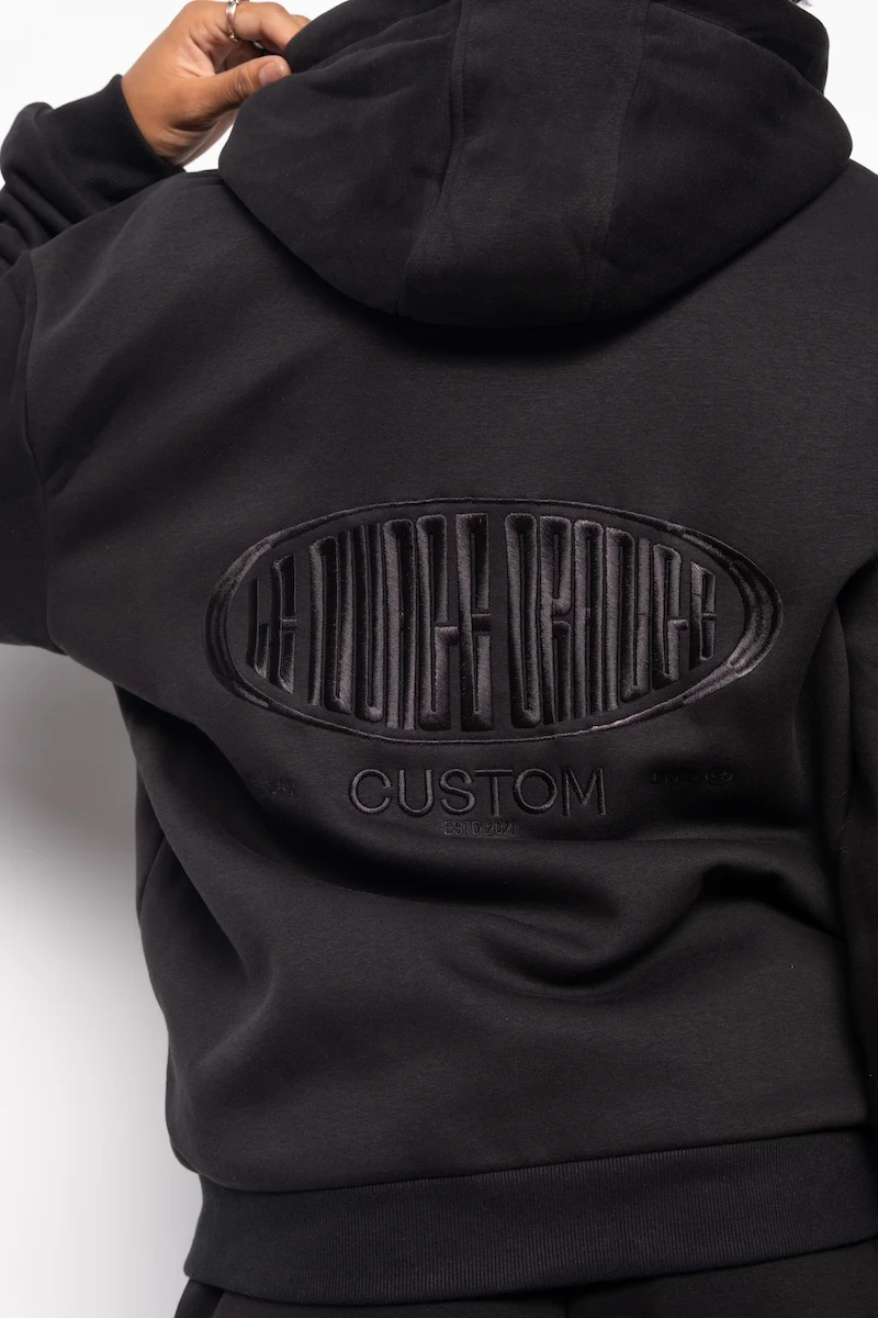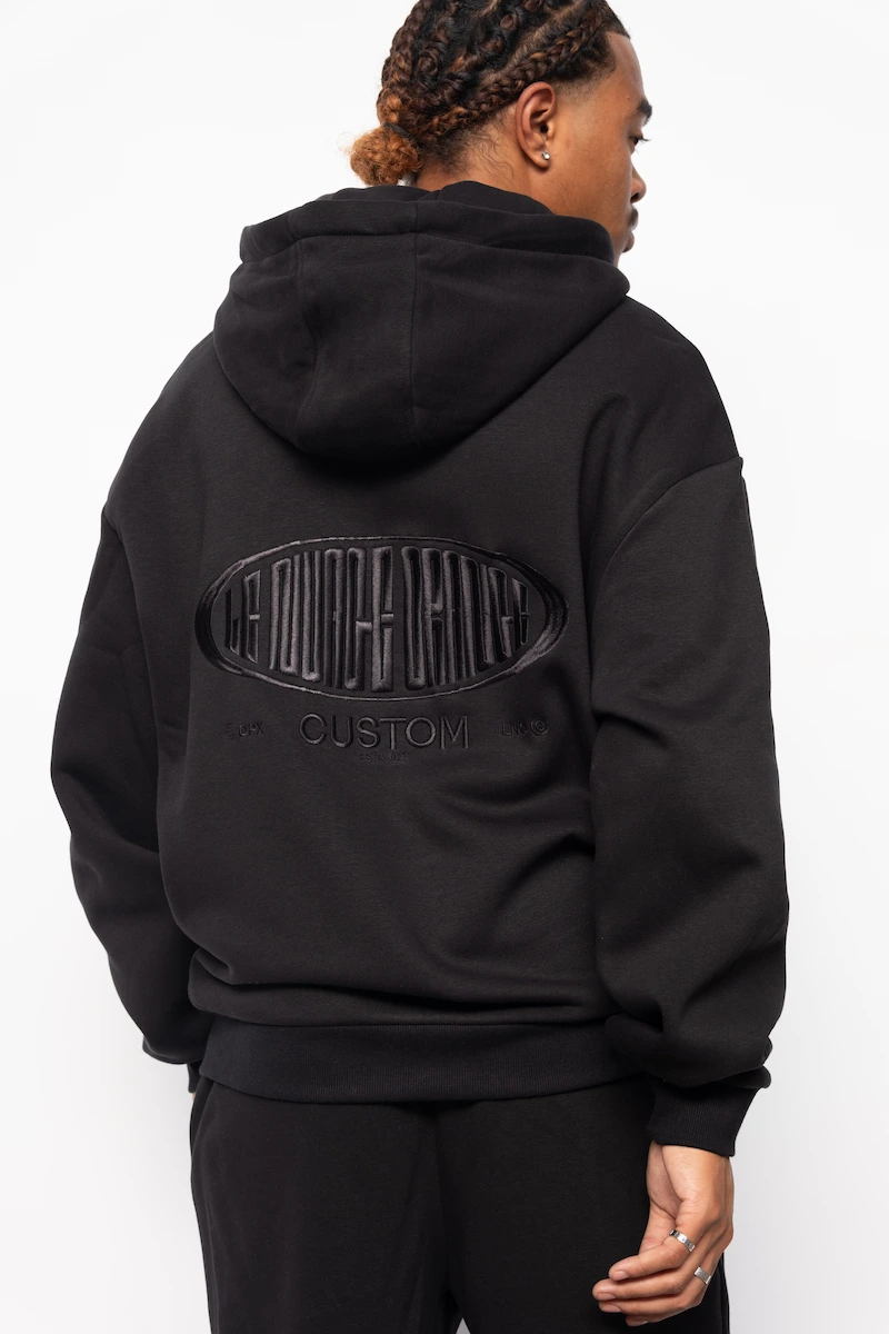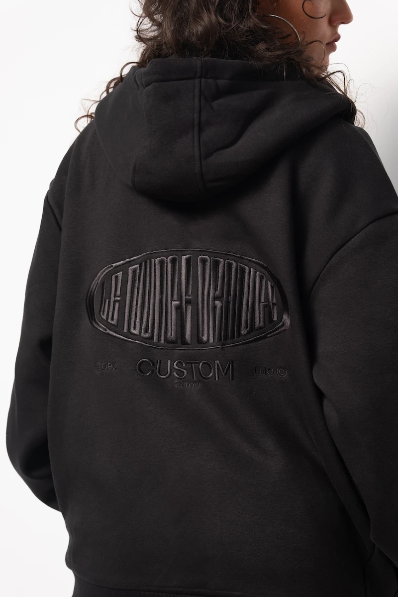 Hoodie Zippé Fluffy Noir Le Nuage Orange Sphere | Base Noir avec petit logo nuage classique brodé en noir sur le haut de la poche et logo Sphere brodé en noir dans le dos | Conçu par nos soins dans notre atelier des Hauts-de-France