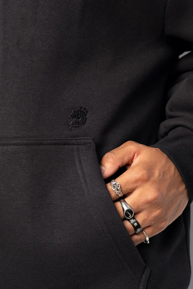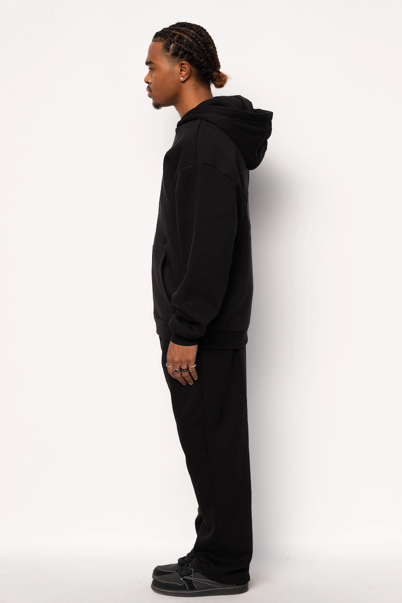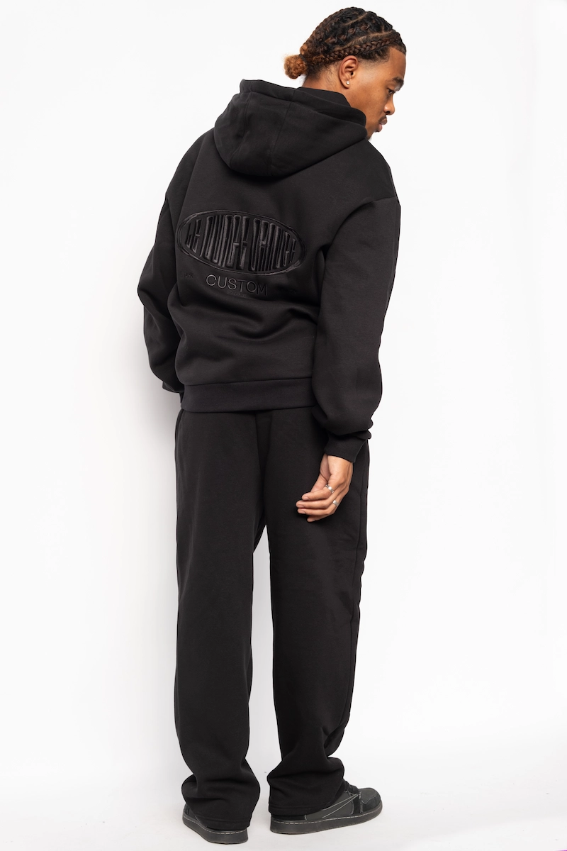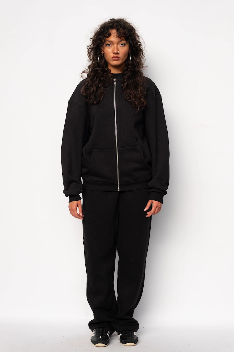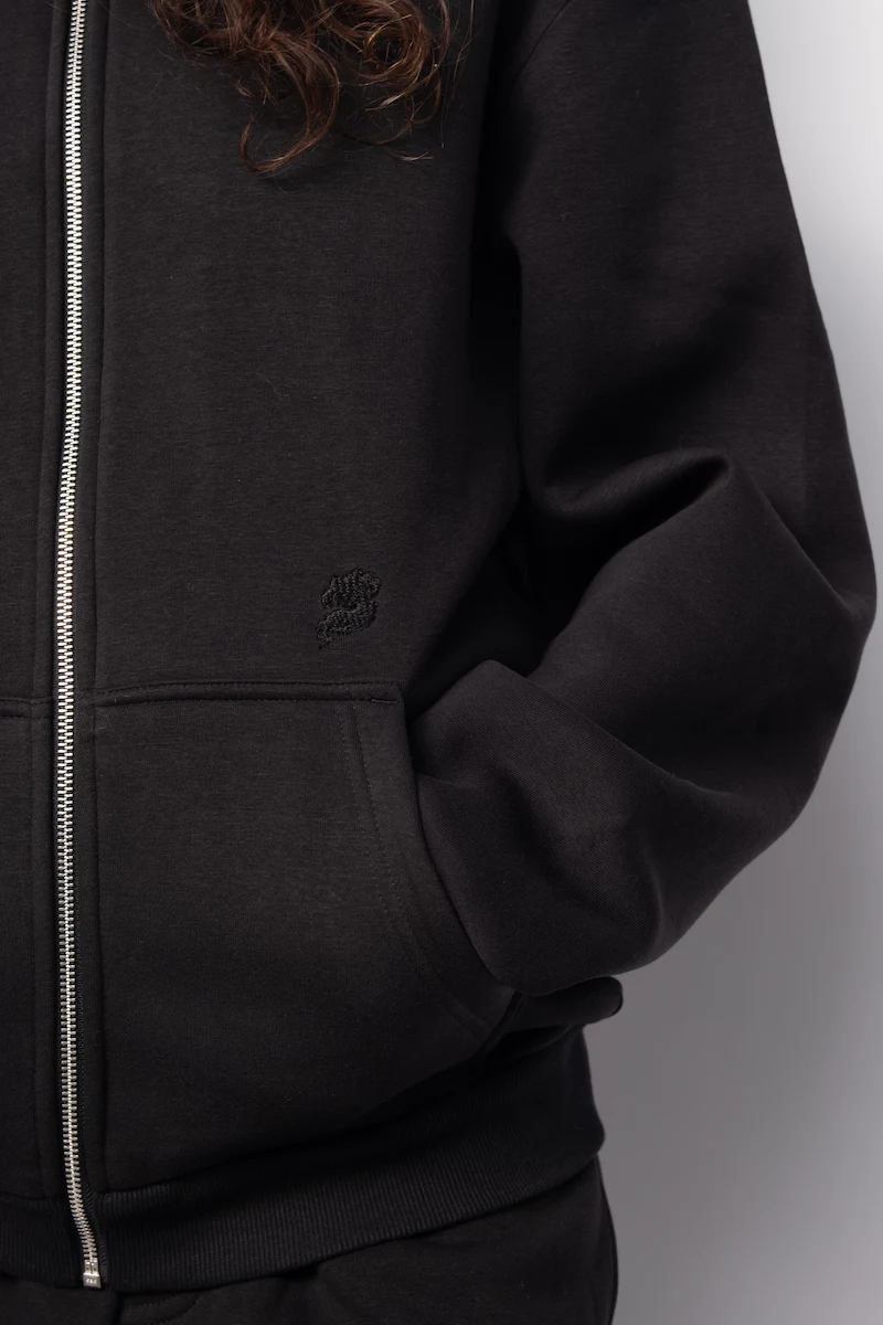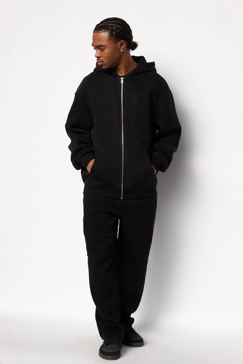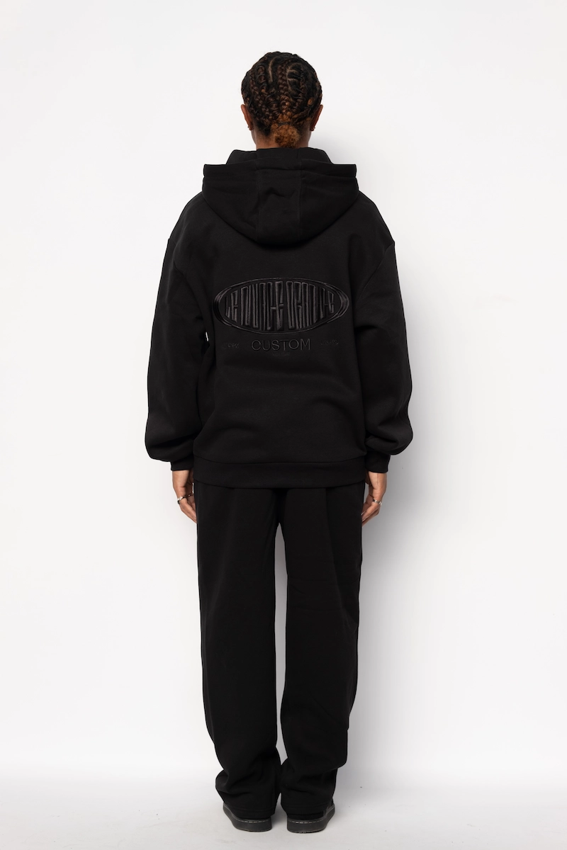 Hoodie Zippé Fluffy Noir Le Nuage Orange Sphere | Base Noir avec petit logo nuage classique brodé en noir sur le haut de la poche et logo Sphere brodé en noir dans le dos | Conçu par nos soins dans notre atelier des Hauts-de-France